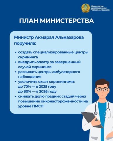 «Проработать создание специализированных скрининговых центров с оплатой за завершенный случай скрининга, а также центров амбулаторного наблюдения за онкопациентами. Региональным управлениям — повысить охват населения скринингами до не менее 70% в 2025 году и довести этот показатель до 80% в 2026 году, а также снизить долю поздних стадий через повышение онконастороженности на уровне ПМСП»,
