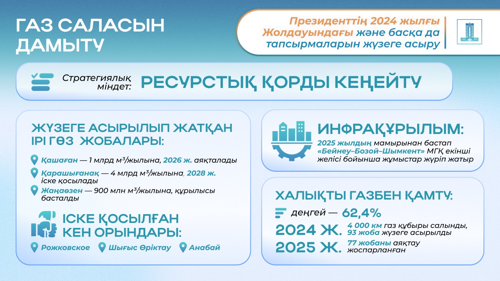 Халықты газбен қамтамасыз етуге келетін болсақ, бүгінгі таңда Қазақстанды газдандыру деңгейі 62,4%-ды құрайды, бұл 20,2 млн халықтың 12,6 млн тұрғынына газға қол жеткізуге мүмкіндік береді. Бұл 2023 жылғы көрсеткіштен 2,4%-ға жоғары. 2024 жылы 4000 шақырымнан астам газ құбыры салынып, 93 жоба жүзеге асырылды.