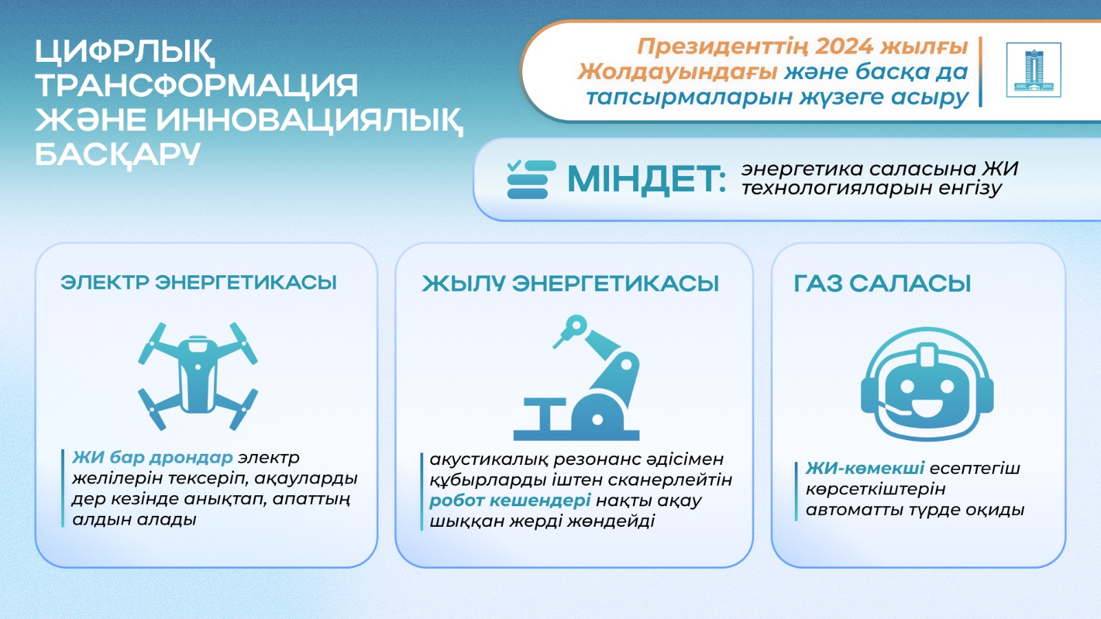 Жаңғыртудың маңызды бағыты заманауи — цифрлық шешімдерді енгізу. Мемлекет басшысының тапсырмаларын орындау аясында салада жасанды интеллект технологиялары белсенді қолданылуда.