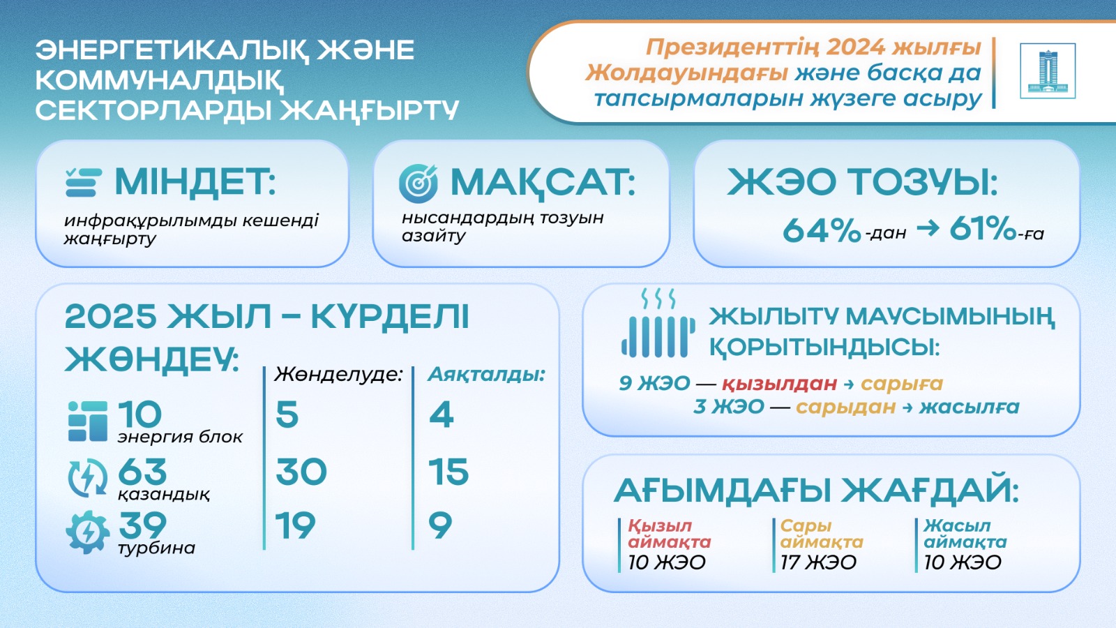ЖЭО-ның тозуын азайту мәселелері Үкіметтің ерекше бақылауында. Кең ауқымды жөндеу науқаны жүзеге асырылуда: 2025 жылы 10 энергоблокты, 63 қазандықты және 39 турбинаны күрделі жөндеу жоспарланған.