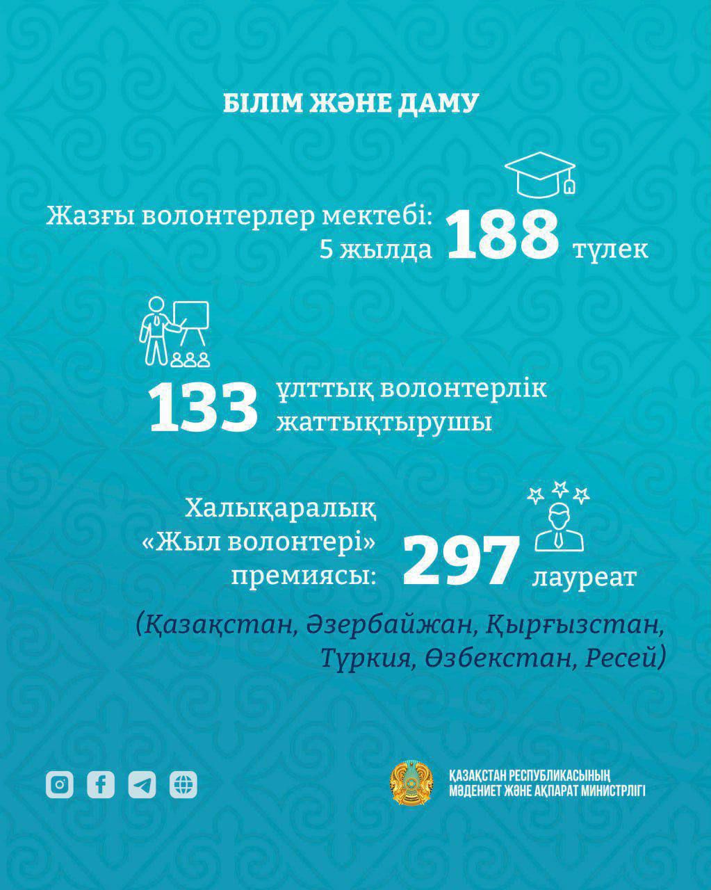 Сондай-ақ волонтерлердің білімі мен дамуына да ерекше көңіл бөлінеді. Жазғы еріктілер мектебін 5 жылда 188 түлек бітірді. Ұлттық волонтерлік жаттықтырушы ретінде 133 адам жұмыс атқарады.