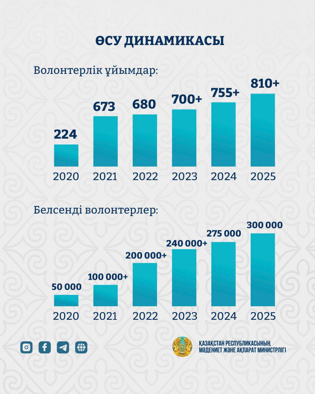 Елімізде волонтерлік қозғалыс дамып келеді. Биыл волонтерлік ұйым саны 800-ден асып, белсенділер 300 мыңға жетті.