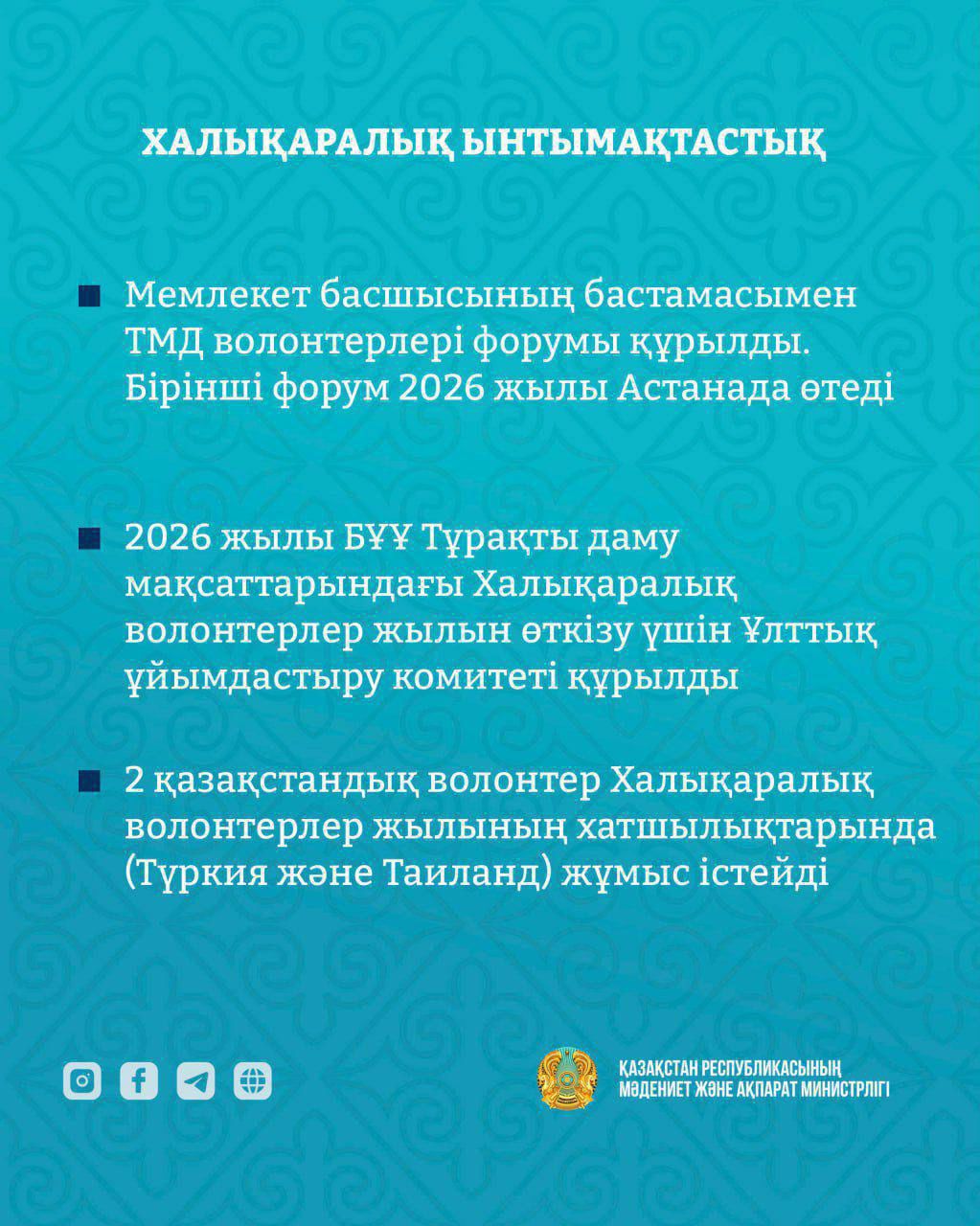 Мемлекет басшысының бастамасымен ТМД волонтерлері форумы құрылды. Бірінші форум 2026 жылы Астанада өтеді. Сонымен қатар БҰҰ тұрақты мақсаттарындағы Халықаралық волонтерлер жылын өткізу үшін Ұлттық ұйымдастыру комитеті құрылды.