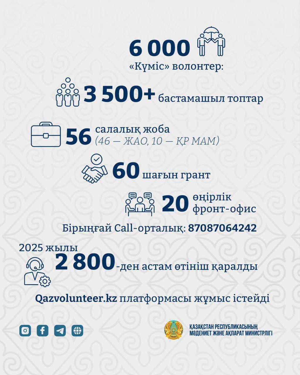 Қазақстанда 6000 «күміс» волонтер бар. Бастамашыл топтардың саны 3 жарым мыңнан көп. 20 өңірде фронт-офис орналасқан. Қазіргі уақытта Qaz.volunteer.kz платформасы жұмыс істейді. Сол арқылы осы жылы 2800-ден астам өтініш қаралды.